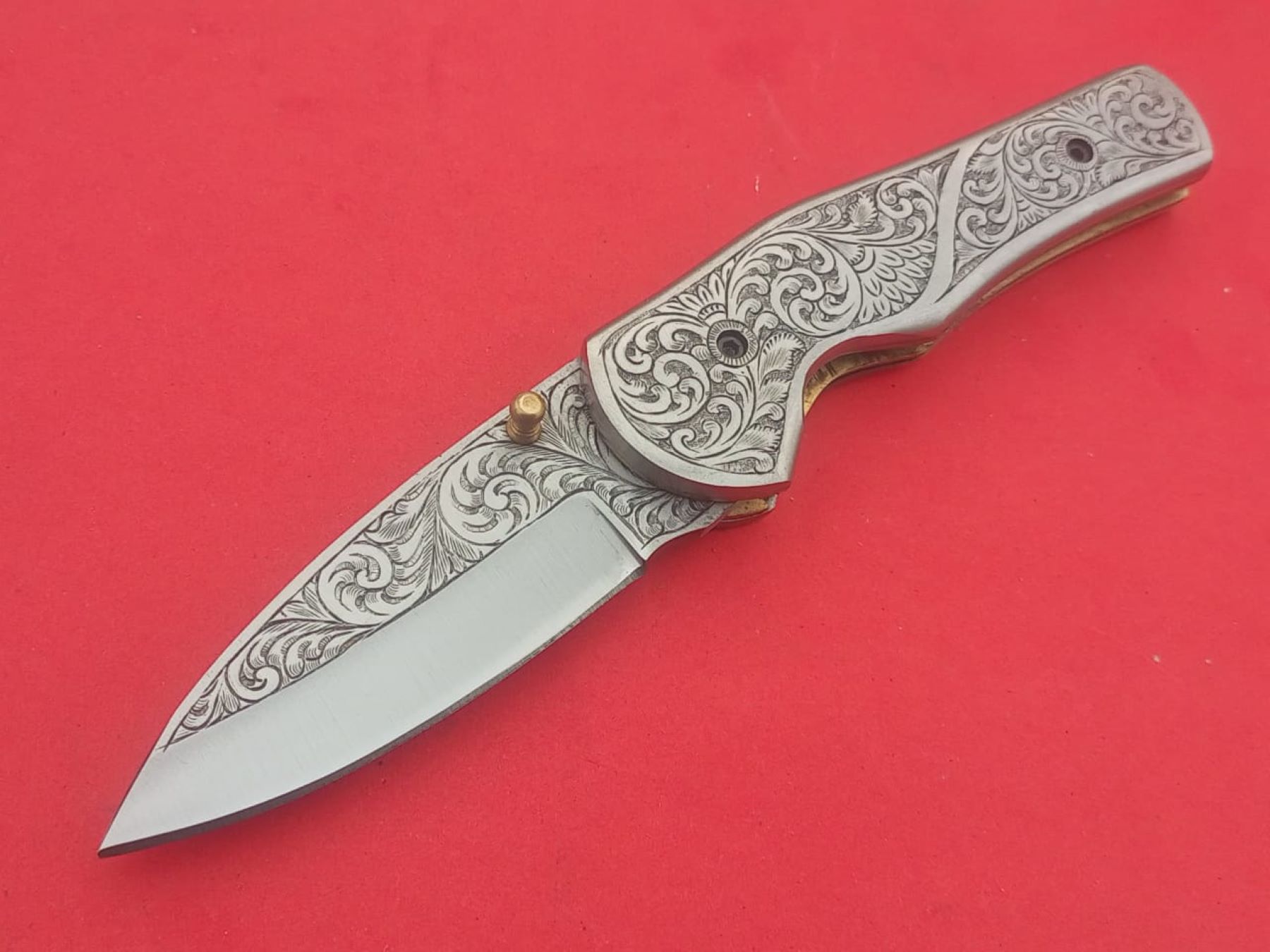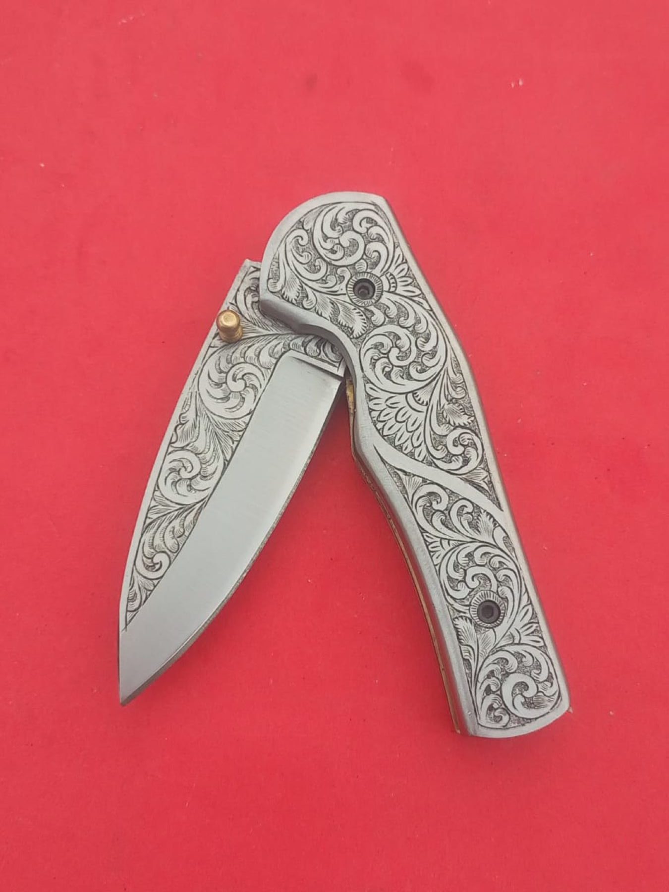 4.5″ Folding Knife D2 Steel blade Engrave stainless Steel handle with leather sheath
